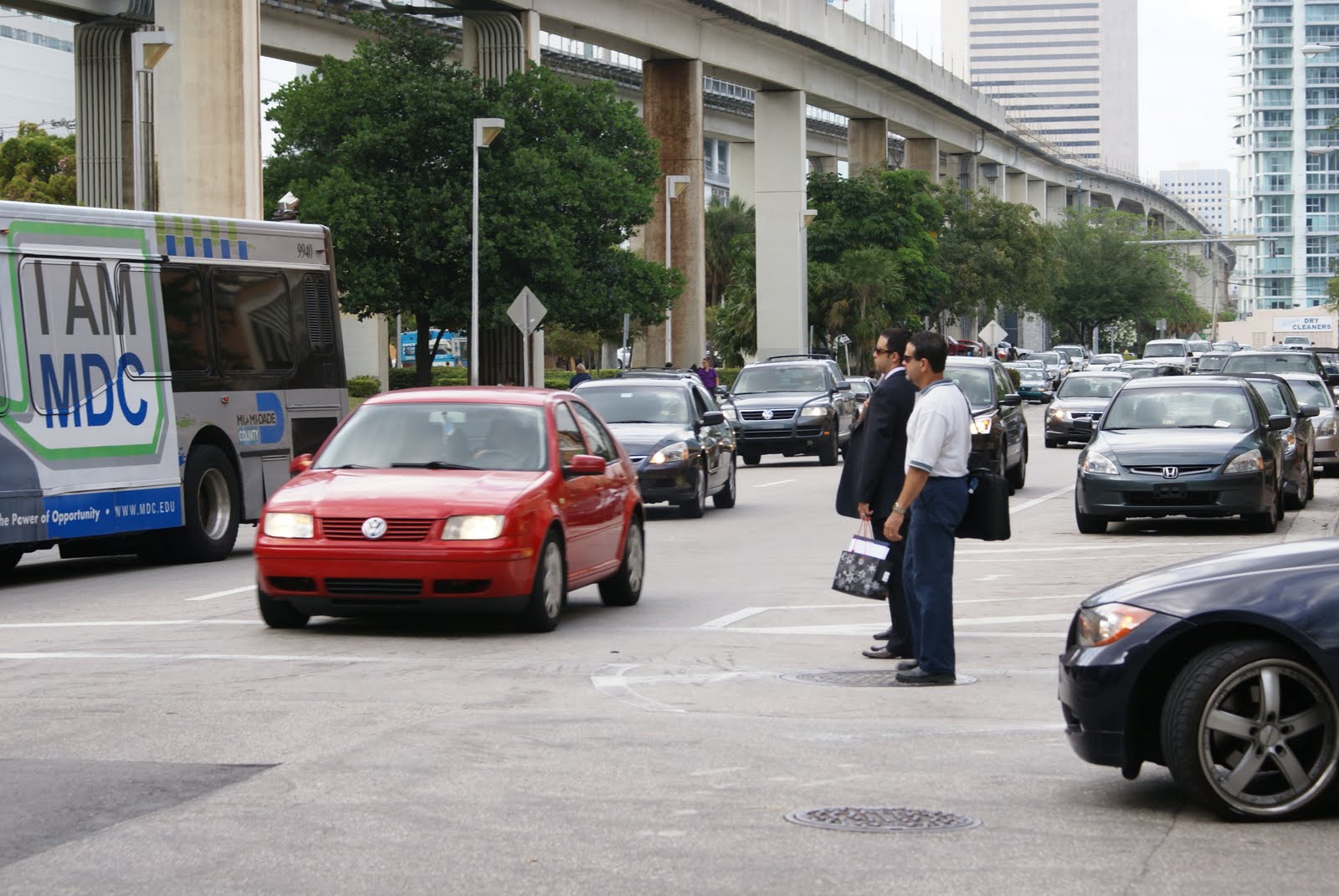 SW 1st Avenue is a prime example of a street that suffers from an extreme identity crisis. The Avenue consists of a pair of one-way thoroughfares which straddle the Miami Metrorail line. It is home to the Brickell Metrorail and Metro Mover Station, which also serves as a bus hub. On the west side, SW 1st is a residential road; while the lane markings are somewhat ambiguous, driver behavior is fairly civil. We can comfortably walk on the sidewalk and cross the street without much thought about speeding cars.